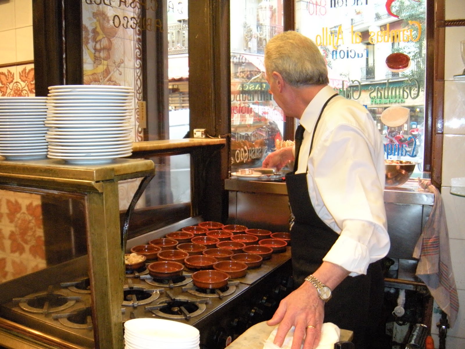 I don’t even know where to begin about the Gambas a Ajillo at Abuelo. They were spicy, buttery, and I can’t even figure out how that combination is possible, especially since they have no butter in them. In a ceramic dish over an open flame, the man sautéed baby shrimp in olive oil and garlic with a red chili. C’est tout. The taste had me almost drinking the remnants in the ramekin. The restaurant was so small, but actually has two locations, the other at the wedge of Calle de Nunez de Arce and Calle La Cruz, where they serve only drinks and traditional Iberian ham.