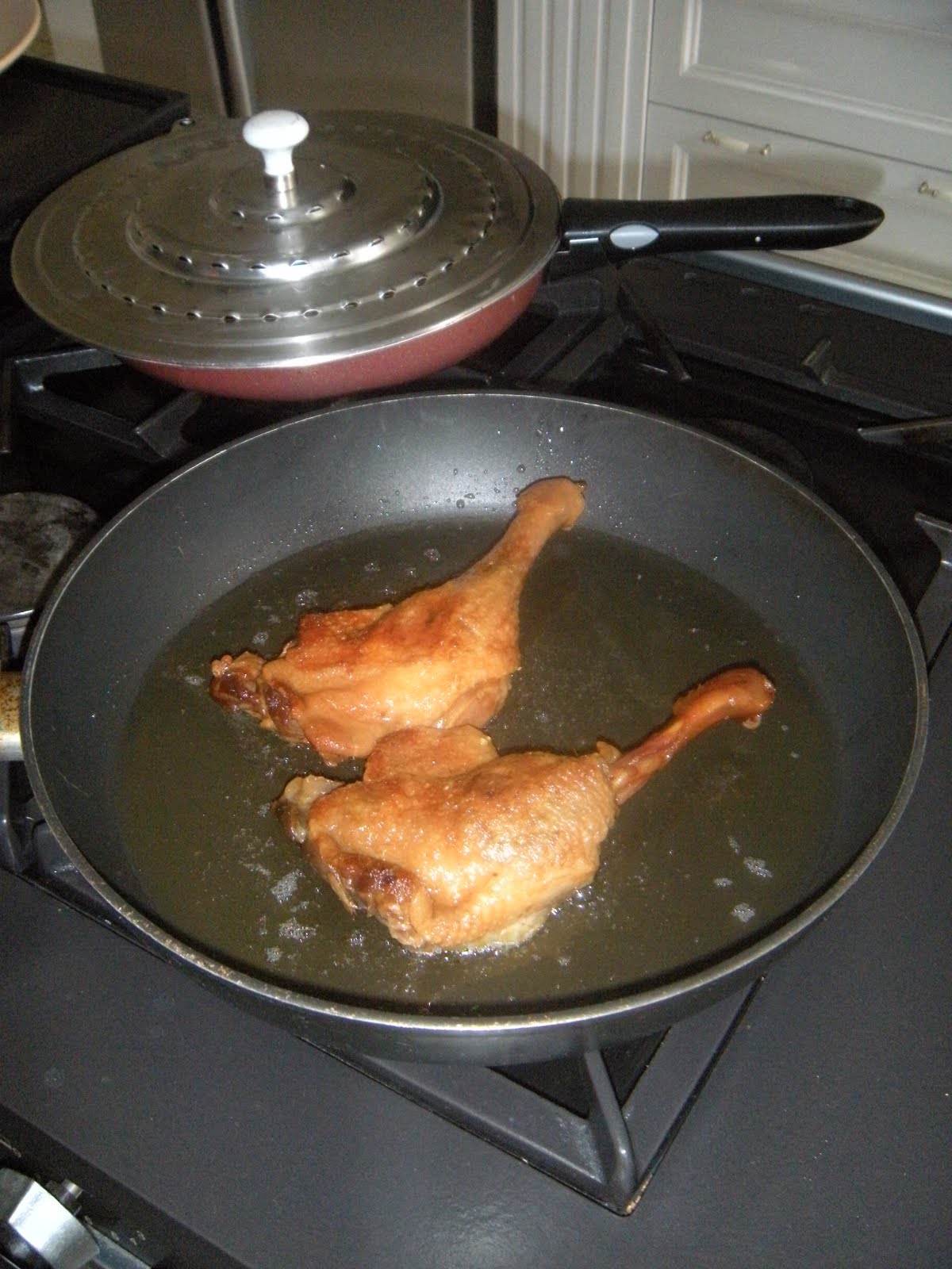 Inside, Suzanne and I put together an aesthetic lunch salad (vous mangez avec les yeux d’abbord) with concentric circles of carpaccio-style potatoes, mache, sliced mushroms, and paper-thin slices of magré du canard fumé (smoked duck breast). We topped it with a homemade vinaigrette. Simple. Marvelous. The duck wasn’t having much luck in our kitchen today because our plat principal also involved the billed species, only this time, we turned our focus to the legs. Suzanne keeps a mason jar of duck fat on her kitchen counter to cook with; I will be keeping a mason jar on mine from this point forward. Over low heat, she cooked the duck legs in fat until they were tender, not dry.