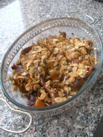 In the meantime, we sautéed diced red onions in butter with a bit of cinnamon. These were so good. They formed the base in our buttered casserole dish, and the duck legs were proudly perched atop. We deglazed the onion pan with a bit of vinegar (stand back, or you’ll get a horrific smelling facial), and added in two tablespoons of honey. This popped a bit at the beginning, so again, another time to be alert so you don‘t get burned. After the sauce reduced and thickened a bit into a carmelized mixture, we added in some chicken stock, dropped in the dates, and poured it over the casserole. We both agreed that had we added more chicken stock at the pan stage, the sauce would have been a bit better consistency and not have thickened up quite so much as we finished the dish in the oven. She prepared a bit of long-grain rice to accompany our chicken dish, however, potatoes or a root vegetable purée would have been nice too. The dish was finished with a sprinkling of toasted almonds, and although mostly comprised of sweet ingredients, was a perfect mélange of salty and sweet.