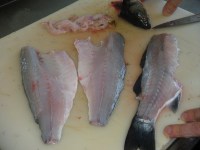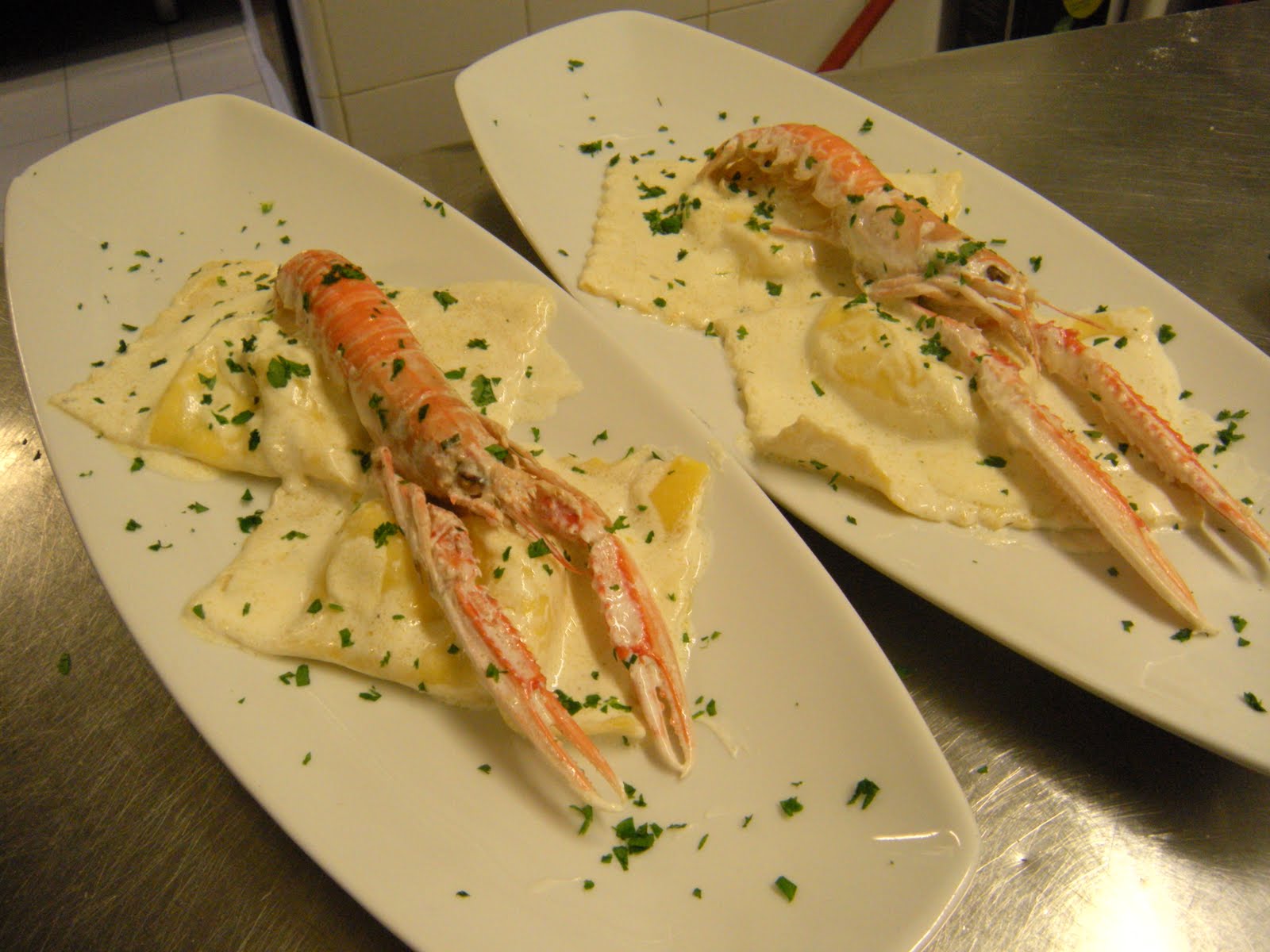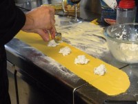 We beheaded and filleted the sea bass (okay, he did), and sautéed it in some olive oil before shredding it up delicately (and checking for eye bones) to add to the burratta for the stuffing. We also cleaned the langoustines, zested and juiced a lemon, sampled some amazing pecorino romano cheese, and discussed our Salice Salentino Rosso wine. It’s a blend of Negroamaro and Malvasia grapes, and has notes of plum and blackberry with a bit of spiciness. It was great with the cheese.