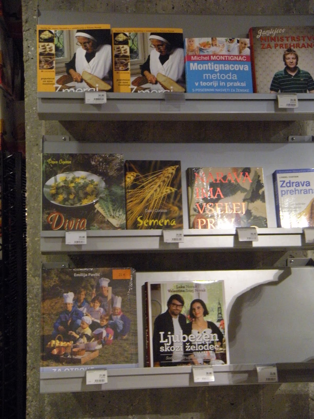 I met her at the train station, and from there, we went to a pretty swanky market in central Ljubljana. It was actually quite interesting because housed in the basement of a would-be department store was a Whole Foods-eque market. And it was packed with people. We stopped first to check out her cookbook on the shelf next to Jaime Oliver’s, and then moved over to the “bio” foods section. They are very popular, and through somewhat broken translation, I gather “bio” equals organic.